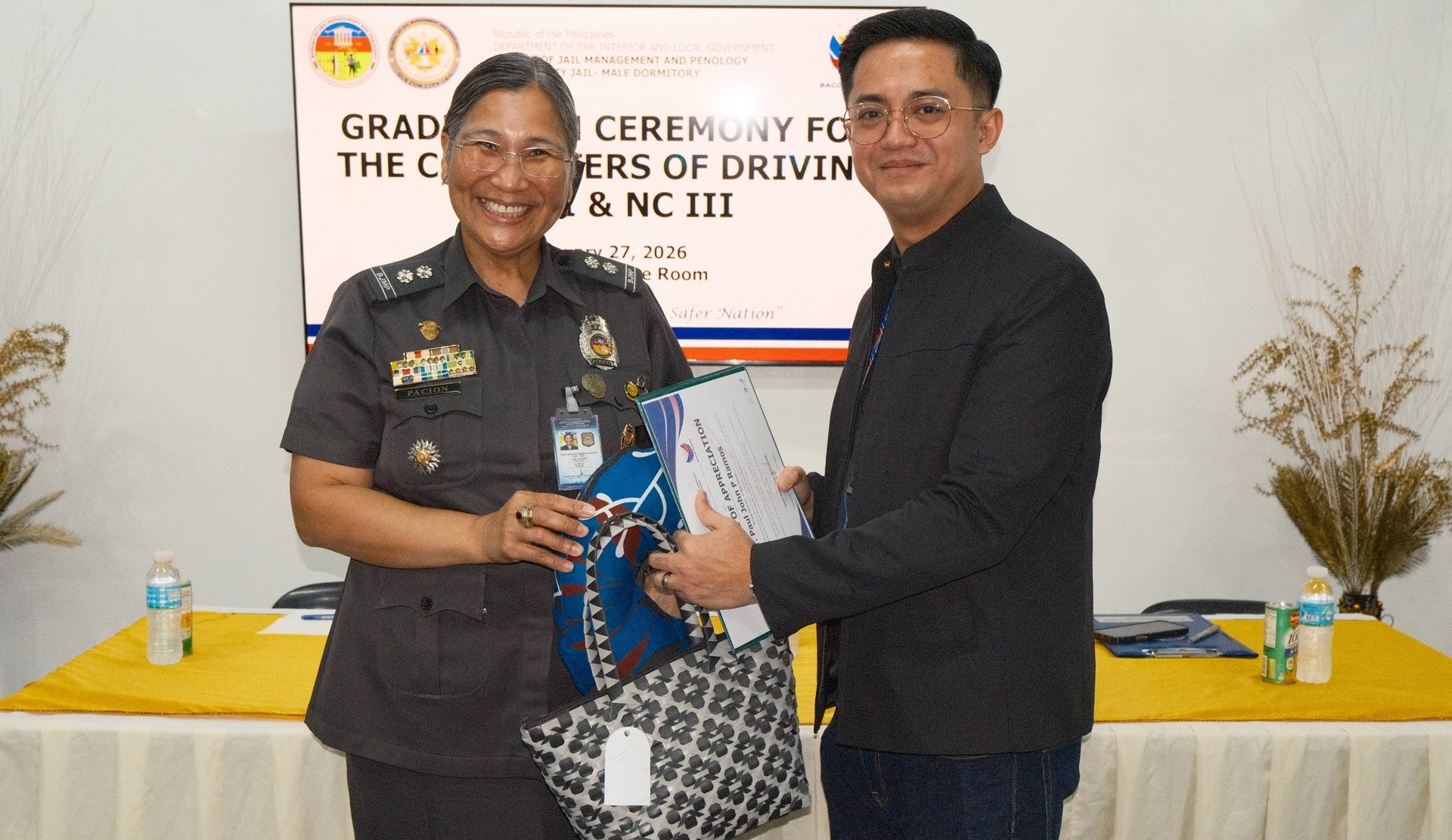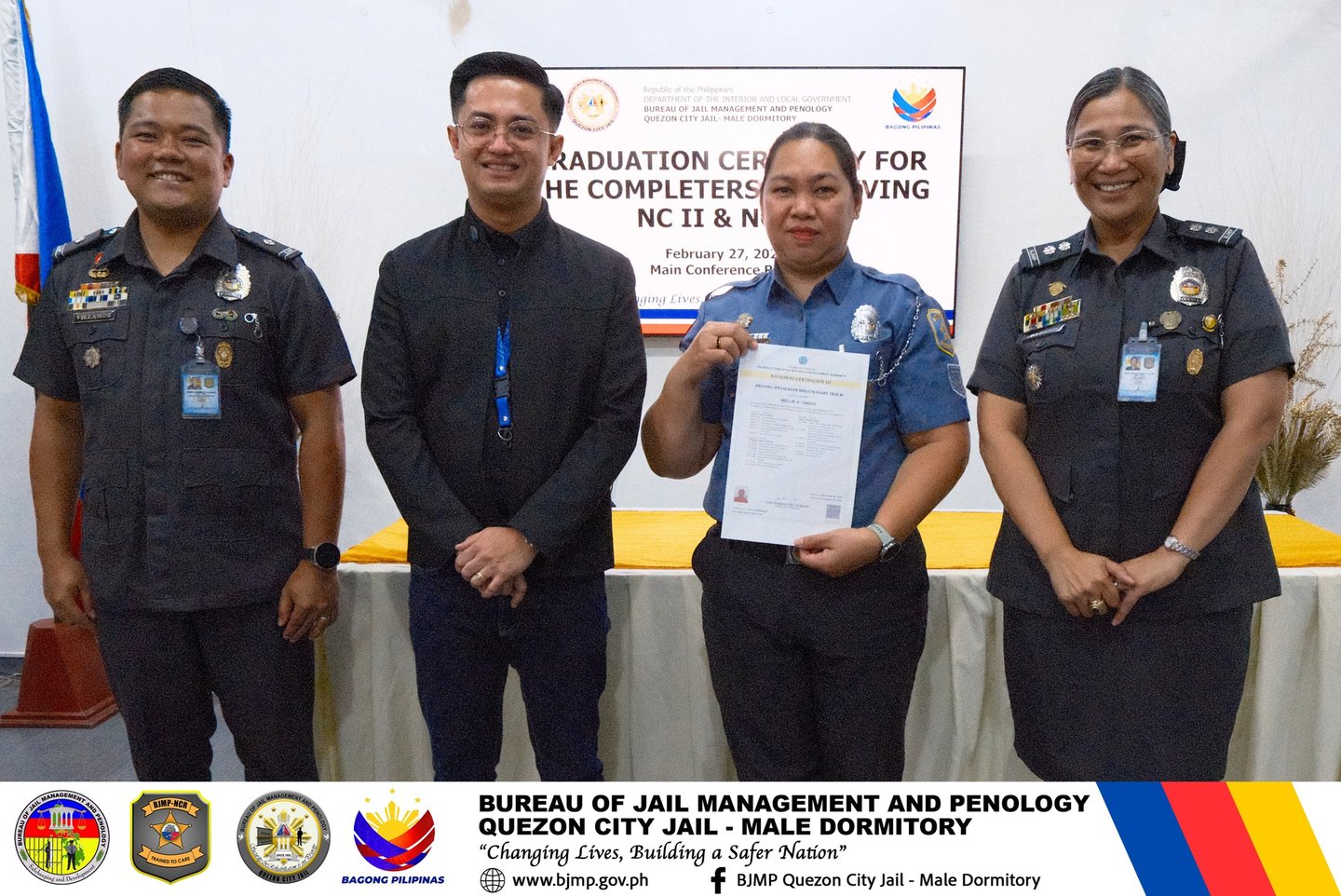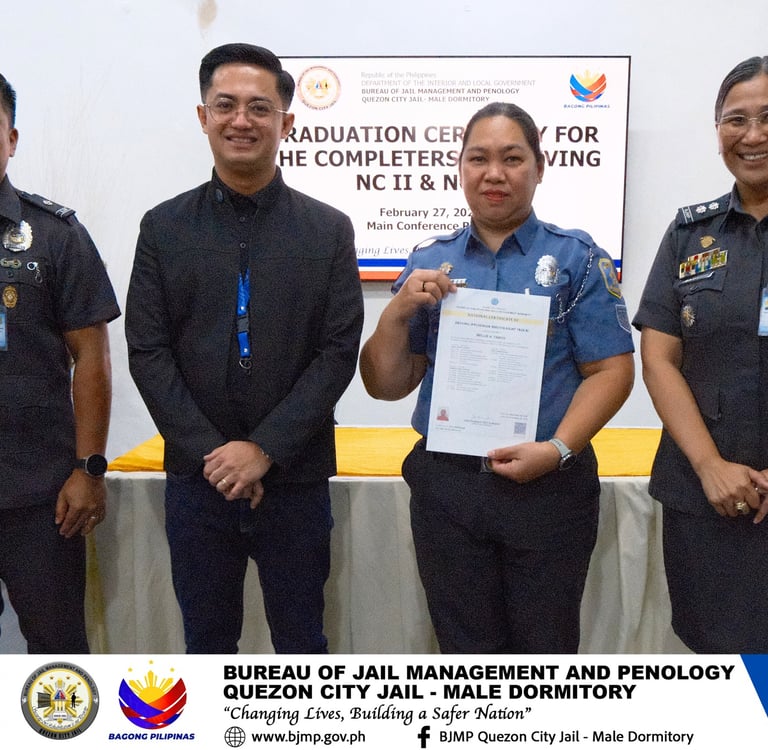 In partnership with TESDA and TOP CHOICE TRAINING INSTITUTE AND ASSESSMENT CENTER INC, the Quezon City Jail Male Dormitory conducted the Graduation Ceremony for personnel who successfully completed the Driving NC II and NC III Courses.