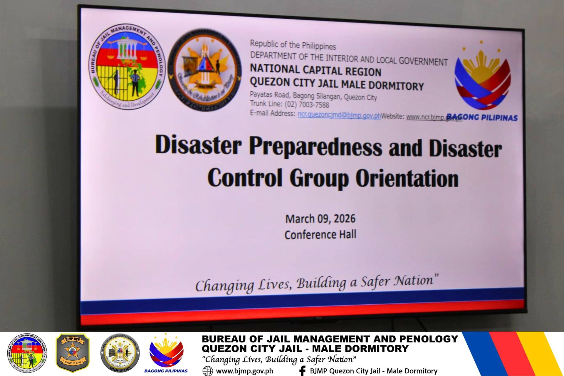 The QC Disaster Risk Reduction and Management Office conducted a Disaster and Preparedness and Disaster Control Group Orientation for Personnel on March 9, 2026 at Quezon City Jail - Male Dormitory.