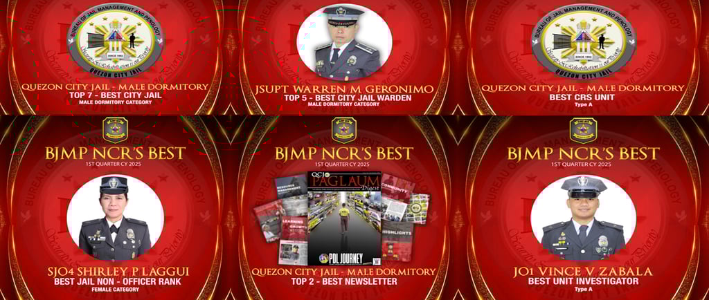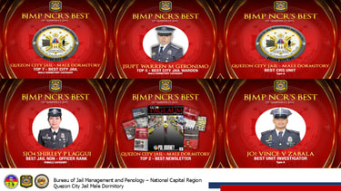 The QCJMD units also brought pride to the facility, winning Best CRS Unit (Type A) and Best Escorting Unit. The QCJ Paglaum Digest, The Official Publication Quezon City Jail - Male Dormitory was awarded Top 2 Best News Letter Outstanding individual performances were also recognized. SJO4 SHIRLEY P LAGGUI as Best Jail Non Officer Rank (Female Category) and JO1 VINCE V ZABALA was honored as Best Unit Investigator.