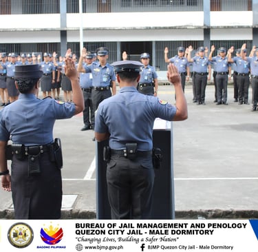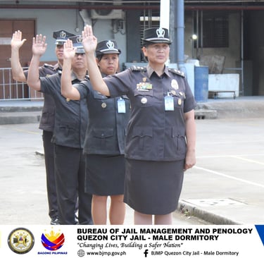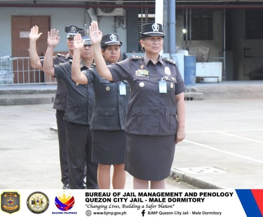 Todayโs Flag Raising Ceremony at QUEZON CITY JAIL MALE DORMITORY was led by CITY JAIL WARDEN JSUPT MARIA LOURDES P PACION RPh, together with JSINSP PHILOMEL P MALAZARTE, JINSP ROGELIO D PEREZ, and JINSP JOSE ABNER E MENDOZA.
