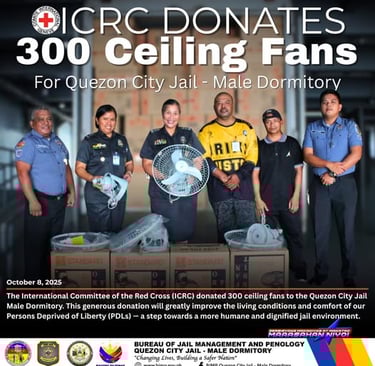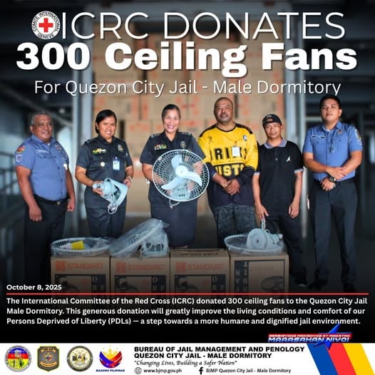 The International Committee of the Red Cross (ICRC) donated 300 ceiling fans to the Quezon City Jail Male Dormitory, received by the City Jail Warden, ๐๐ฆ๐จ๐ฃ๐ง ๐ ๐๐ฅ๐๐ ๐๐ข๐จ๐ฅ๐๐๐ฆ ๐ฃ ๐ฃ๐๐๐๐ข๐ก, and ๐๐ฆ๐๐ก๐ฆ๐ฃ ๐ฃ๐๐๐๐ข๐ ๐๐ ๐ฃ ๐ ๐๐๐๐ญ๐๐ฅ๐ง๐, Chief Welfare and Development Section.