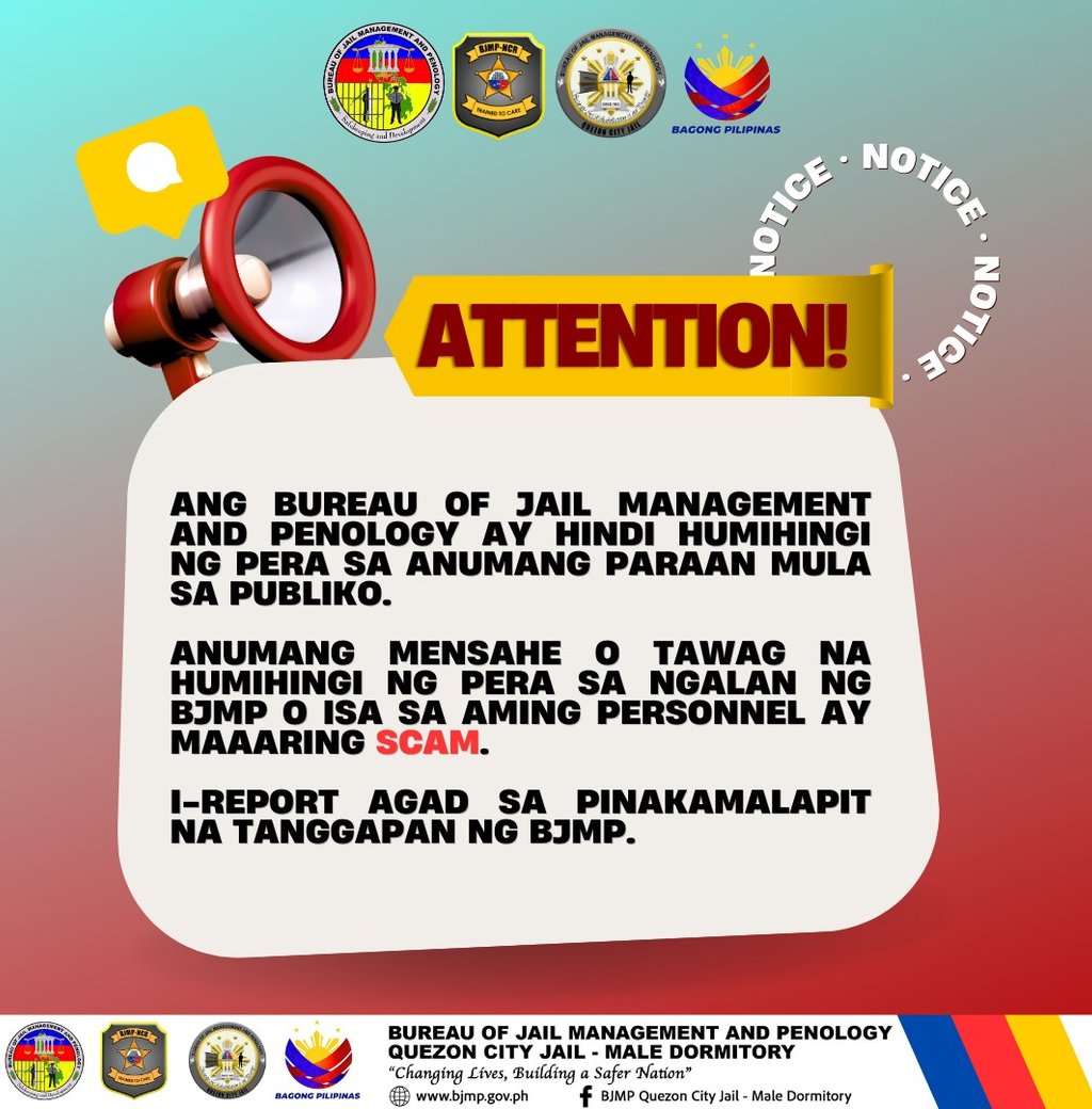 Anumang mensahe o tawag na humihingi ng pera sa ngalan ng BJMP o isa sa aming personnel ay maaaring SCAM.