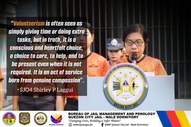 In continuation of the 18-Day Campaign Against VAW, the Quezon City Jail Male Dormitory held its Monday Flag Raising Ceremony, reaffirming discipline, duty, and commitment to a safe and humane environment. During her value-focused discussion, SJO4 Shirley P Laggui highlighted that true volunteerism is a conscious choice to care, help, and serve with compassion.
